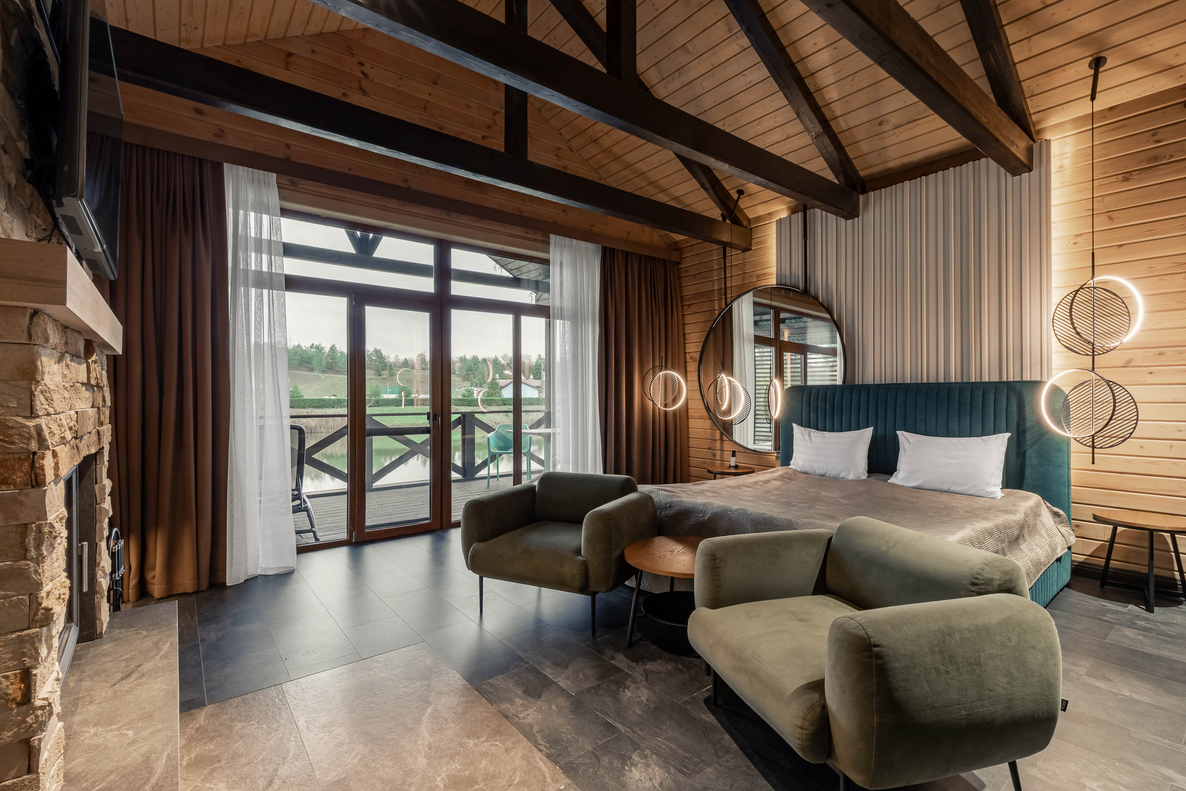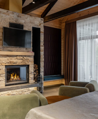 Private terrace with a lake view; fireplace; separate entrance; TV; wardrobe or closet; hospitality tray (electric kettle, sugar, tea bags); mini toiletries (shower gel, lotion, shampoo); chairs; towels; fridge; air conditioning; bathrobe