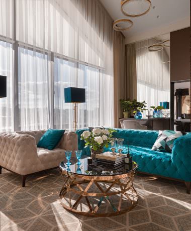 The room consists of a spacious living room with panoramic windows, a separate bedroom, and one bathroom with a whirlpool bath and a private sweet sauna.