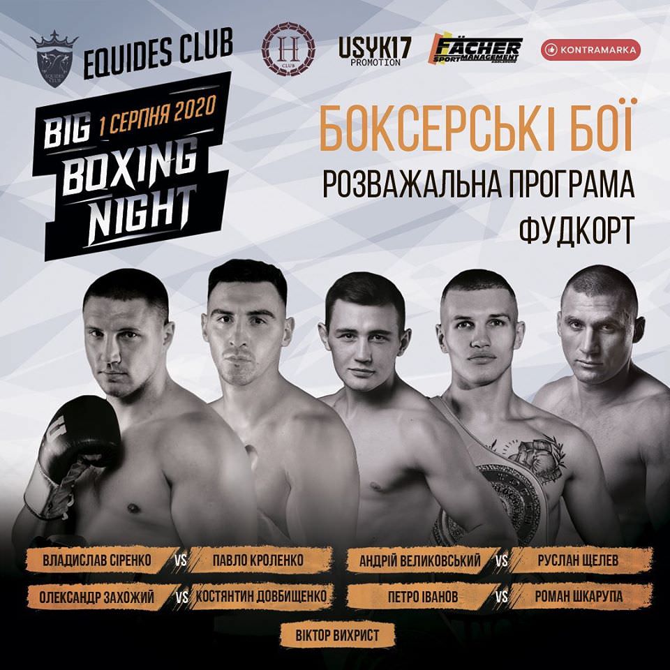 Big Boxing Night – найочікуваніше open air шоу літнього сезону 2020 в Україні, що вперше презентує унікальний формат – поєднання спортивного драйву та витонченої світської вечірки в колі всесвітньо відомих спортсменів і зіркових гостей. Розважальна програма за участю Злати Огневич, Серьога (Поліграф ша- рікoff).